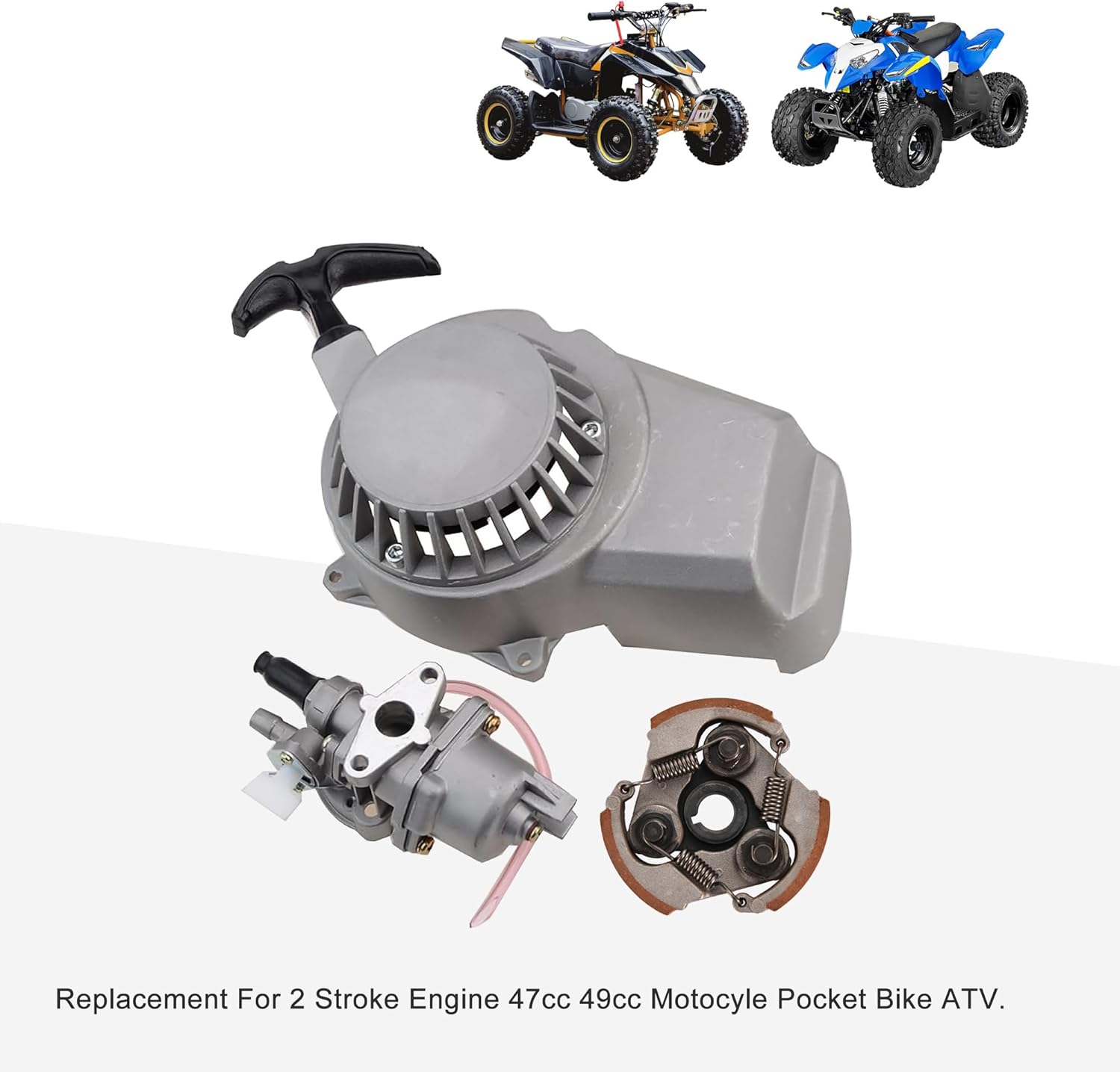 Get your mini dirt bike back to full power. This comprehensive engine tune-up kit is specifically designed for 2-stroke 47cc and 49cc engines, most commonly found on the SSR SX50, pocket bikes, and mini quads. By replacing the carburetor, starter, and clutch simultaneously, you eliminate the most frequent failure points in small 2-stroke motors.