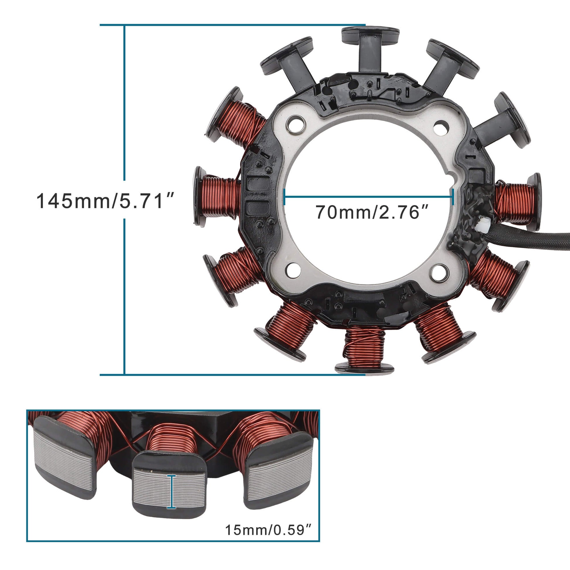 Size:stator coil outer diameter:145mm/5.71";inner diameter:70mm/2.76" ;thickness:15mm/0.59". The ignition magneto stator coil is made of copper coil,full copper-clad steel wire,aluminum plate,with higher power,higher pressure,more stable spark and sensitive throttle. Please check the model number,size,and picture before ordering to make sure this is the correct part. Package including:Generator Magneto Stator Ignition Coil x 1pc,GOOFIT keychain x 1pc.