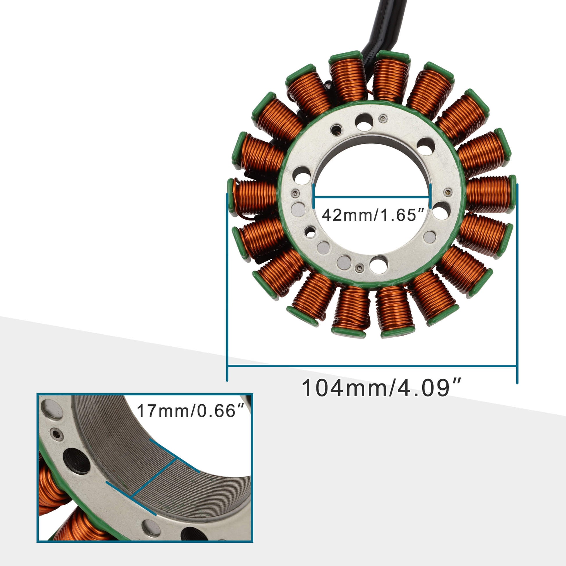 Size:stator coil outer diameter:104mm/4.09";inner diameter:42mm/1.65";thickness:17mm/0.66". Made with high-temperature resistant copper wire and premium insulation for stable power output and long-lasting durability. Please check the model number,size,and picture before ordering to make sure this is the correct part. Package including:Stator Magneto Coil x 1pc,GOOFIT keychain x 1pc.