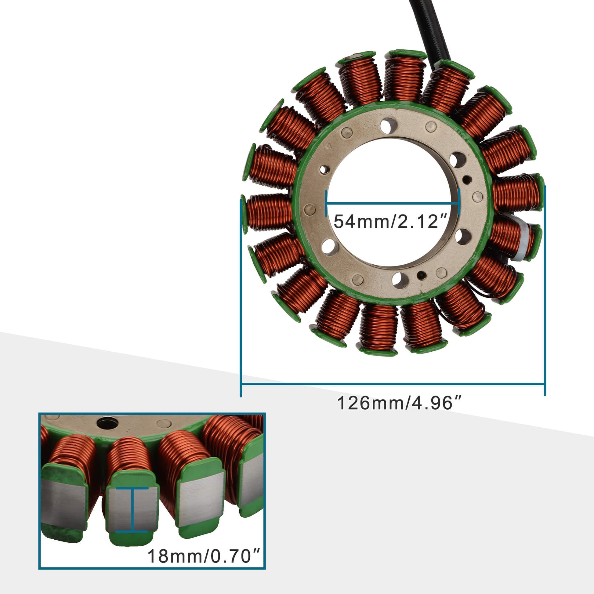 Size:stator coil outer diameter:126mm/4.96";inner diameter:54mm/2.12";thickness:18mm/0.70". Made with high-temperature resistant copper wire and premium insulation for stable power output and long-lasting durability. Please check the model number,size,and picture before ordering to make sure this is the correct part. Package including:Stator Magneto Coil x 1pc,GOOFIT keychain x 1pc.
