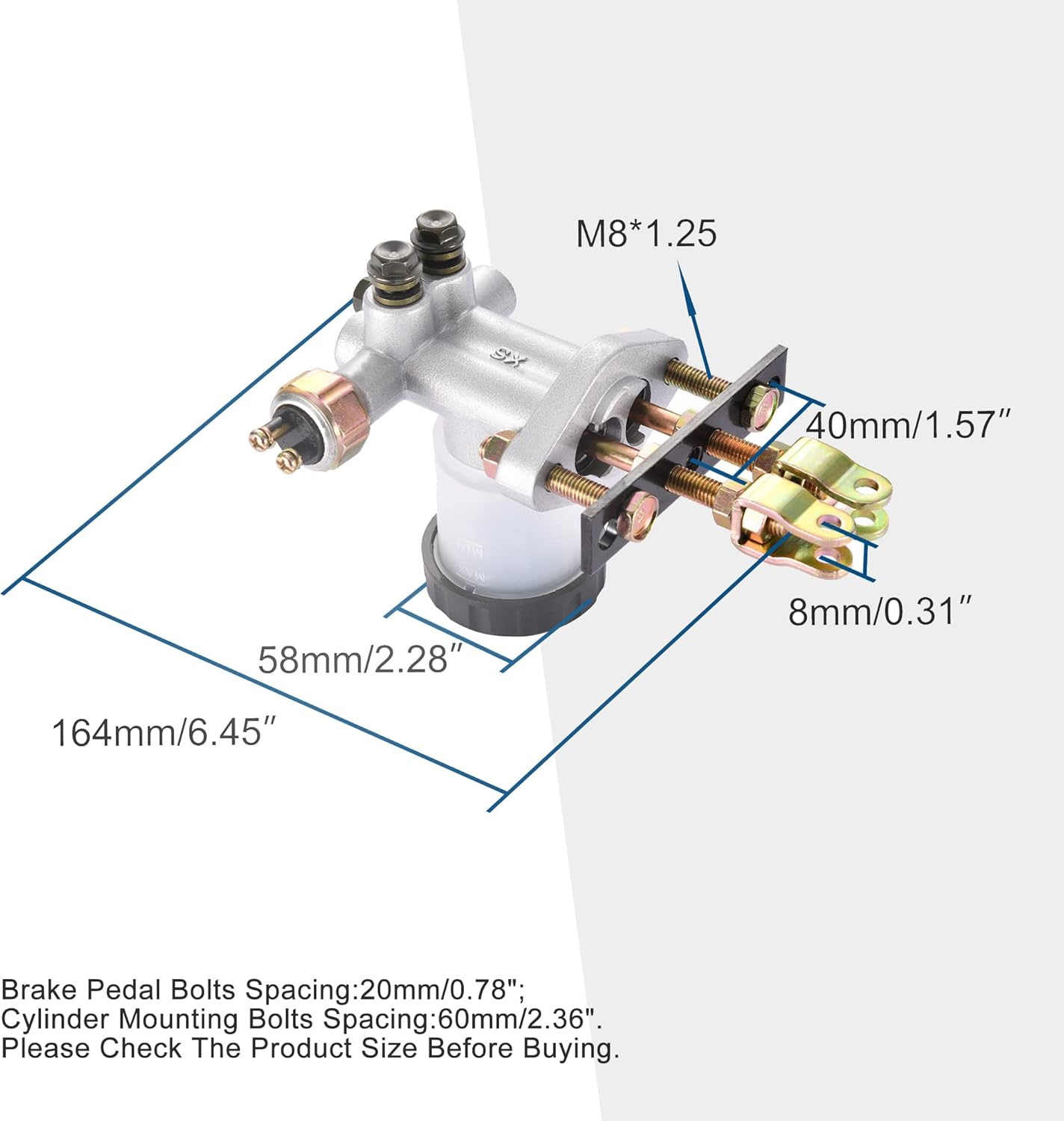 - Brake pedal bolts spacing:20mm/0.78",cylinder mounting bolts spacing:60mm/2.36"